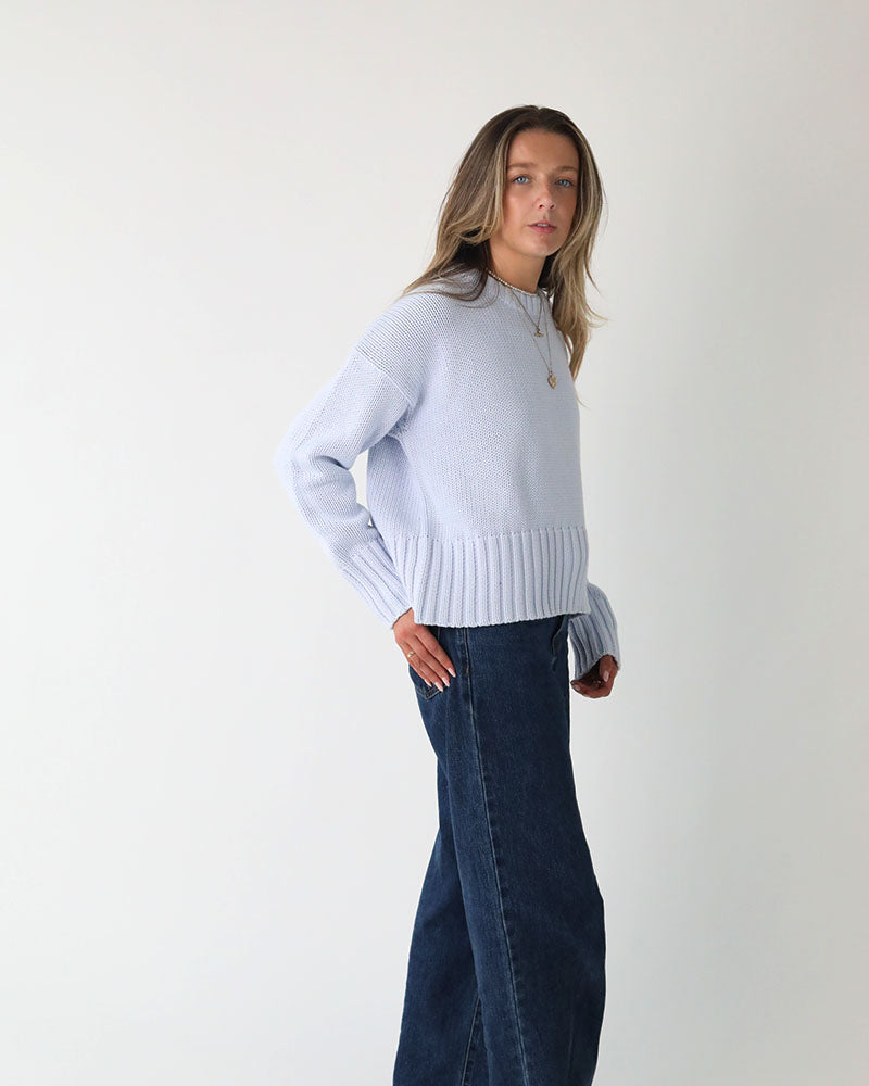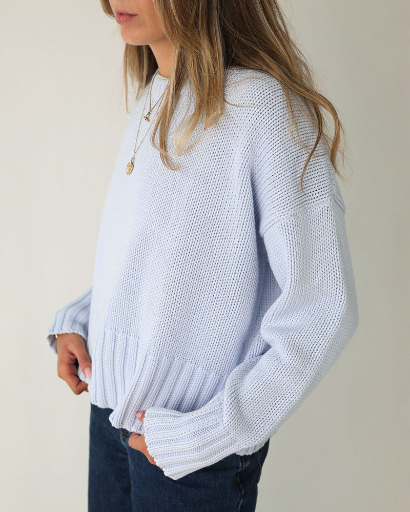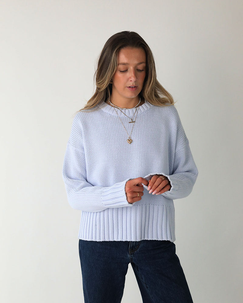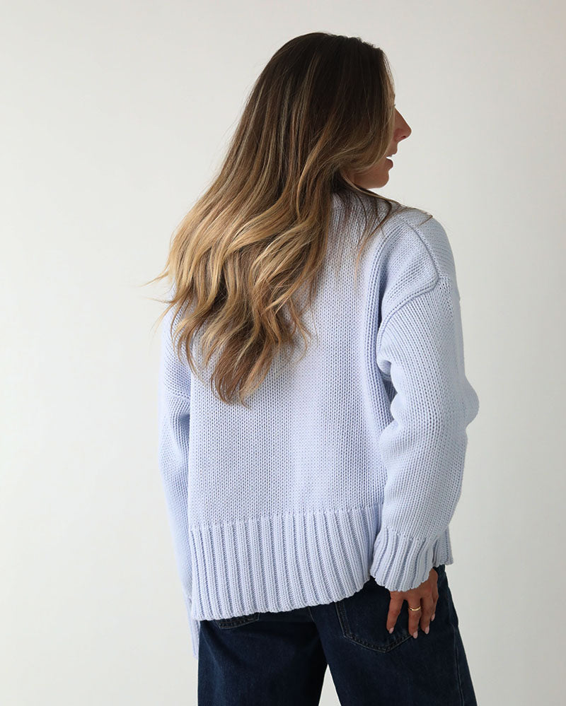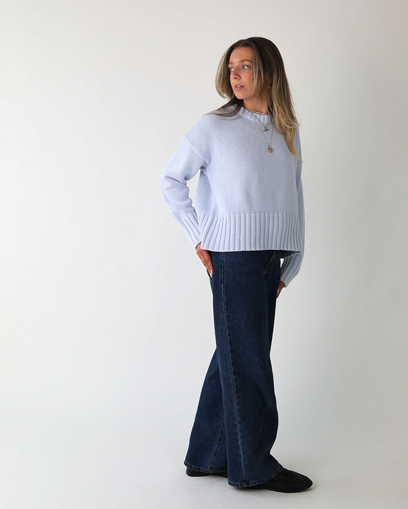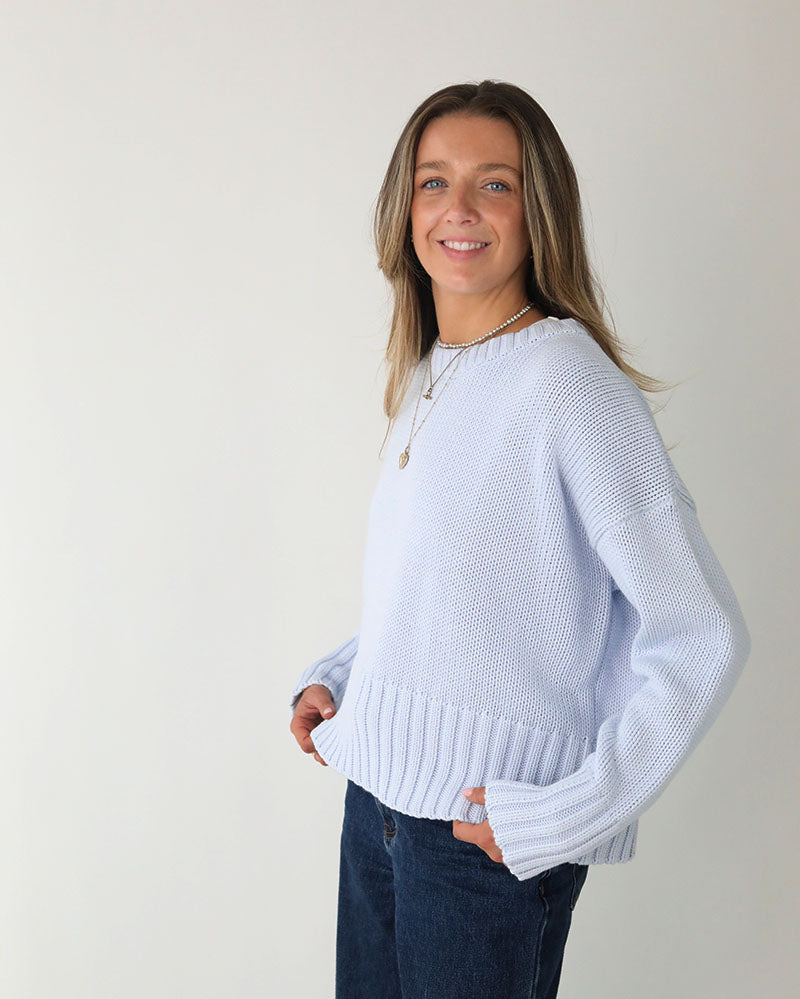 Introducing The Newly Improved Hettie Jumper In a Soft Baby Blue cotton for Spring Summer 26. The Quiet Luxury Style Designed to Travel from Work to Weekend.