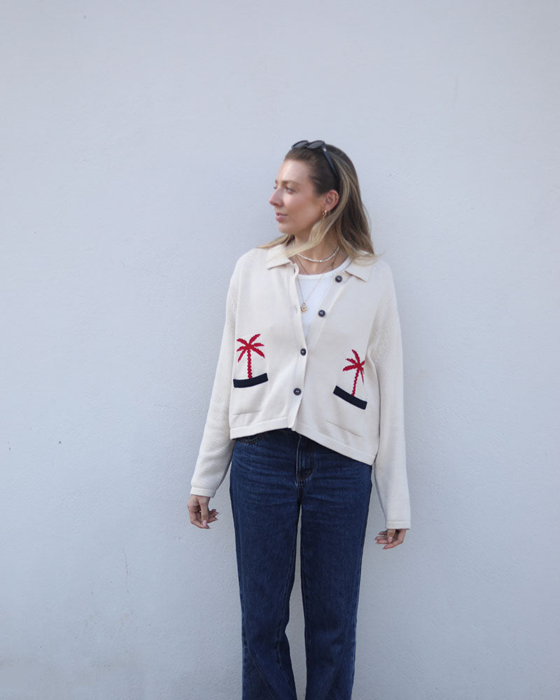 Theres something about palm trees that we associate with holidays, rest and fun all bundled into one, and it felt like time to drop some into our knitwear. This Cardi will do all the talking for you so we recommend pairing with a pair of Navy high waisted denims or our new Byron Trouser.